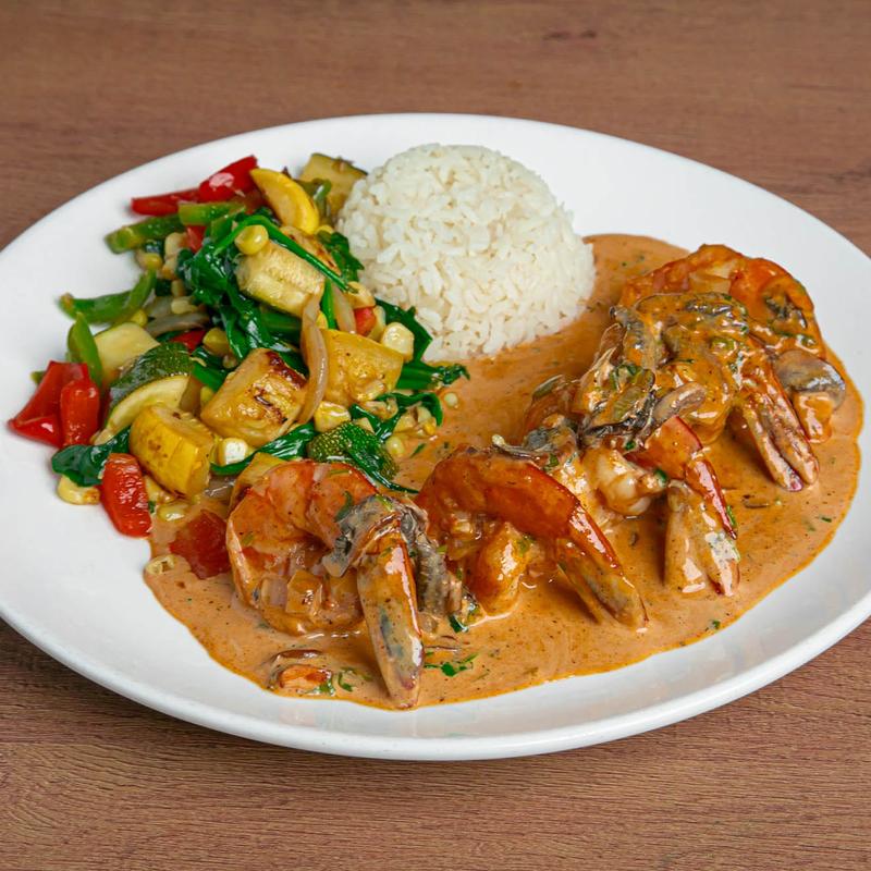 Wild Mexican prawns, sauteed in chardonnay, secret spices, mushrooms, and herbs. Served with white rice and grilled vegetables.